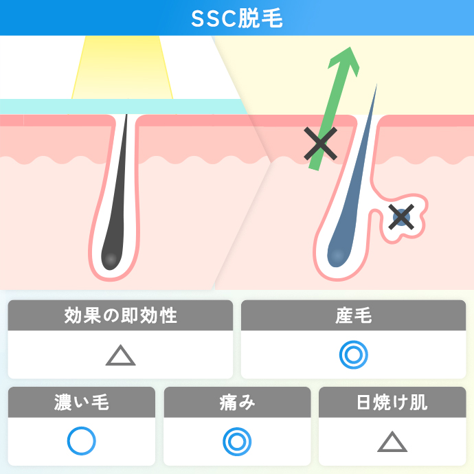 「SSC脱毛」はIPLと同じくレーザー方式ですが、肌に抑毛効果のあるジェルを塗ることで、痛みを抑えながら脱毛することができます。