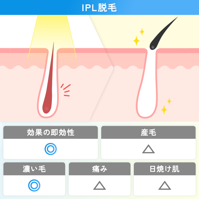IPL脱毛はレーザーによって毛根にダメージを与えて、毛を抜けさせる方法で、医療レーザー脱毛に近い仕組みです。