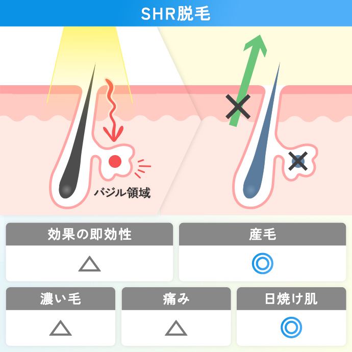 「SHR脱毛」は発毛の指令を出す細胞へダメージを与えて毛が生えるのを遅らせる方法で、「産毛」にも効果が期待できます。