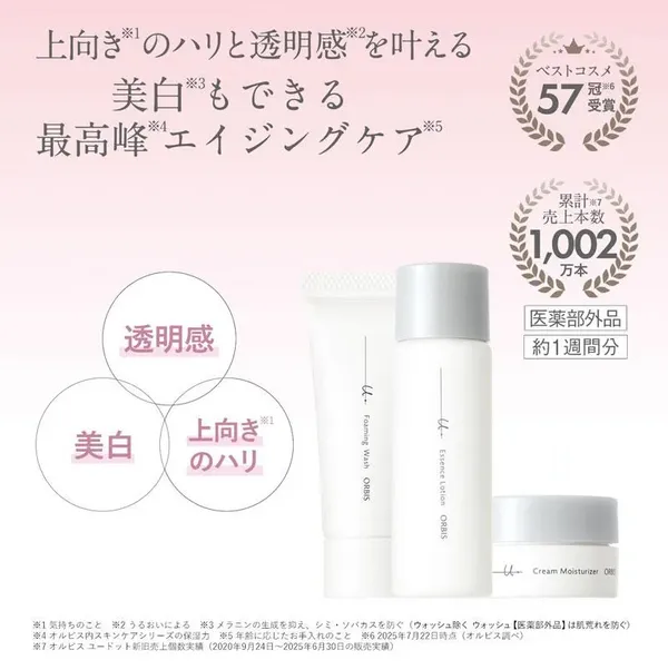 *1:オルビスユー ドット売上個数実績(2020年9月24日~25年6月30日の販売実績)*2:乾燥、ハリ・ツヤのなさ *3年齢を重ねた肌にうるおいを与える事 *4:2022年12月17日時点、オルビス ユードット(リニューアル前)受賞 *5:乾燥・古い角質やキメの乱れによる *6:ロニセラカエルレア果汁、ノバラエキス=うるおいを与えハリと透明感に満ちた肌へ導く保湿成分(G.D.F.=Good Daily Facecare の略称です) *7:メラニンの生成を抑え、シミ・ソバカスを防ぐ *8:2025年7月22日時点(オルビス調べ 2022年8月23日発売オルビスユーシリーズ) *9メマツヨイグサ抽出液、スイカズラエキス =角層のすみずみまで水分・油分を保ち、ハリ・ツヤを与える保湿成分 *10初回限定セットに入っているリンクルブライトセラムに配合されている成分です。*11ローション、モイスチャライザーに配合