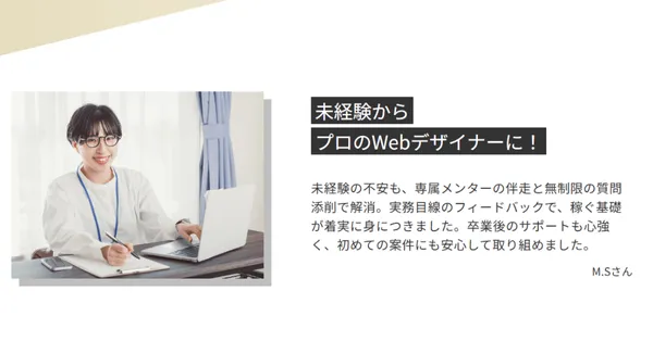 「挫折せずに学びきれる」「完全未経験からでもWEBデザインを学べる」と人気を集めています。
