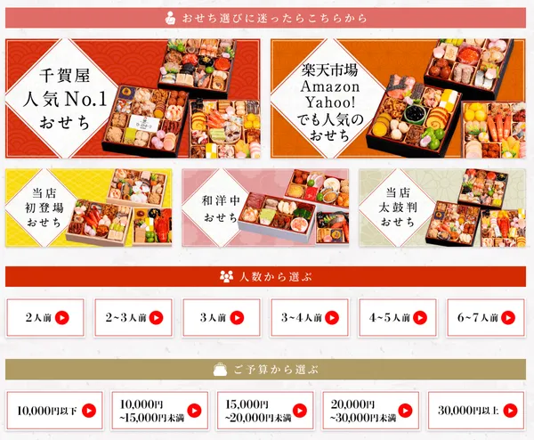 和洋中のおせちを取り揃えており、多彩なラインナップからおせちを選ぶことができます。予算や人数から選べるフィルターも設けられており、選択肢を整理しながら自分や家族に合ったおせちを探せます。品数も多く様々な料理が楽しめるので飽きることなく味わうことができます。