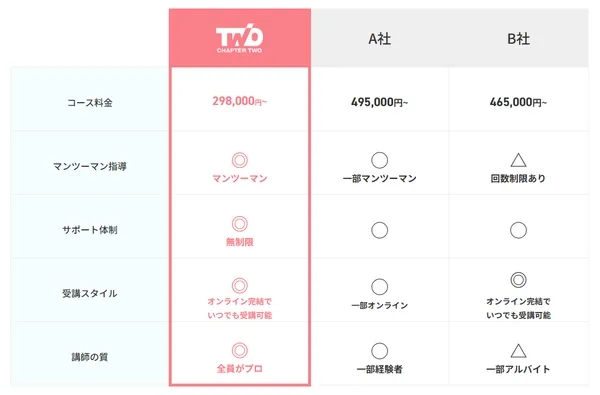 学習内容、授業システム、仕事サポートの充実度はスクールトップ級で、「Webデザインで稼ぐコト」にこれほどフォーカスしているスクールはChapter Twoの他に無いと言えるでしょう。受講料は通常398,000円(税込)のところ、今ならなんと限定料金で10万円OFFの298,000円(税込)で受講することができます。
