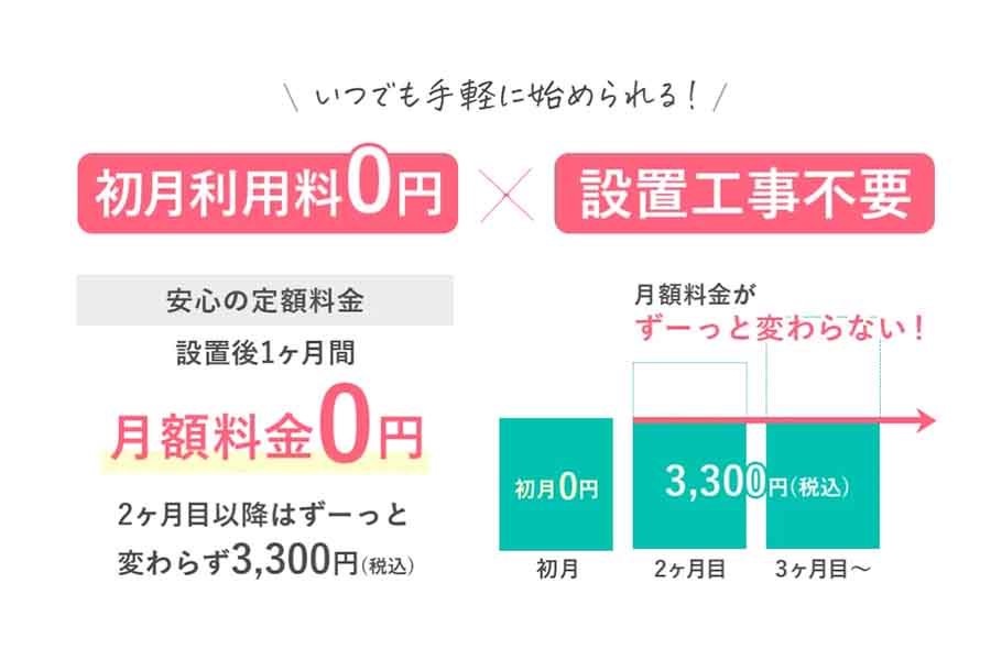 最初にサーバーをご自宅まで届けるときに出荷手数料として2,200円(税込)かかりますが、設置や工事費用などは発生しません。しかも、初月の利用料は無料です。2ヶ月目以降は、月額3,300円(税込)とサーバーの電気代だけで使い続けられます。