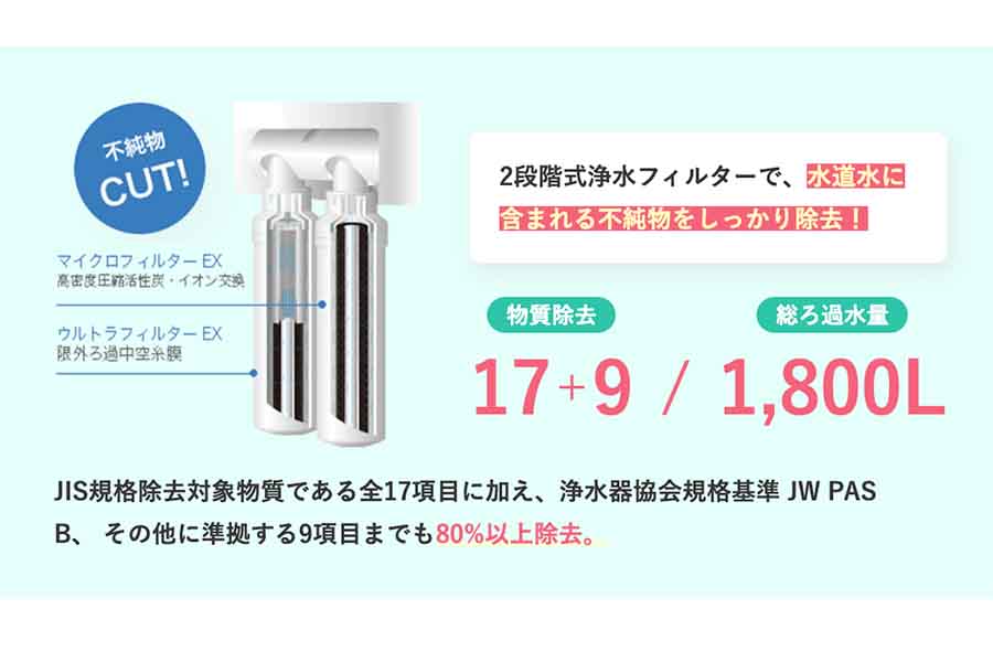 水道水を優れた浄水機能で美味しくしてくれます。JIS規格の除去対象物質全17項目に加え、水銀やカドミウムなど9項目も除去することが試験結果で分かっています。除去率は80%以上です。新しいフィルターが6ヶ月に1度定期的に届くので浄水能力低下の心配はありません。