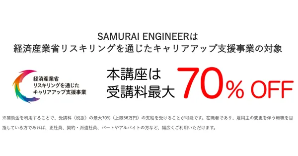 SAMURAI ENGINEERは、国(経済産業省)の「リスキリングを通じたキャリアアップ支援事業」の対象です。