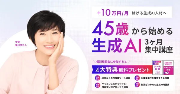 最大の特徴は、「ミドルシニア世代専門で、自分の経験×生成AIスキルで月+10万円を目指す」超実践型カリキュラムにあります。単なる「使い方」ではなく「稼ぎ方」まで徹底サポートし、週1回のグループライブ授業と個別課題で、同世代の仲間と交流しながら学べます。