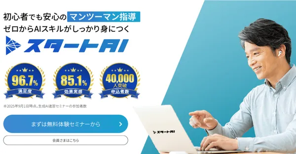 年齢や経験に関係なく、生成AIを基礎から実践まで体系的に学びたい方におすすめなのが、スタートAIです。
