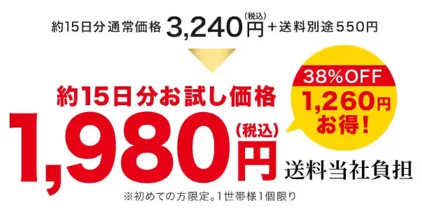約15日分の商品を、通常3,240円のところ38%OFFの1,980円(税込)で試すことができます。