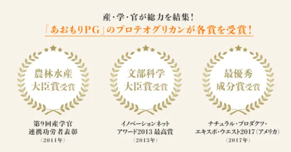 使用されている成分は、弘前大学が開発した抽出技術によって生まれた高品質な「あおもりPG」のプロテオグリカン。農林水産大臣賞や文部科学大臣賞を受賞した研究技術から生まれた成分で、信頼性の高い関節サポート成分として注目されています!