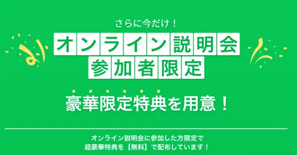 さらに今なら、オンライン説明会に参加した方だけに、インスタマネタイズの完全攻略講座(100枚以上のスライド)を無料でプレゼントするキャンペーンを実施中。まずは説明会に参加して、豪華な無料特典をお受け取りください!
