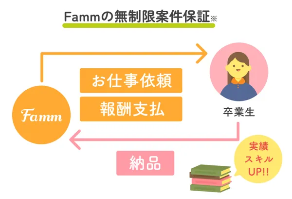 さらに、卒業後Fammから実際の案件発注を無制限で保証してくれます。目に見える実績と経験が積み上がることで、次のお仕事に繋げている方が多数います。その上、単発ではない長期案件のご紹介も増えています。