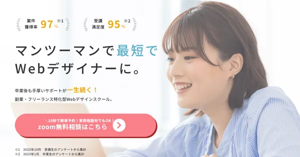 現役WEBデザイナーにマンツーマンで教えてもらえるため、挫折しにくいく、完全未経験からWEBデザイナーを目指せると人気を集めています。